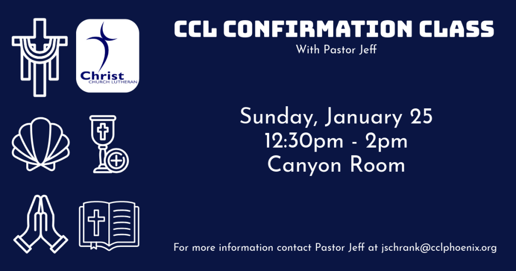 The next class will be Sunday, January 25 from 12:30-2:00pm in the Canyon Room. Pastor Jeff will
