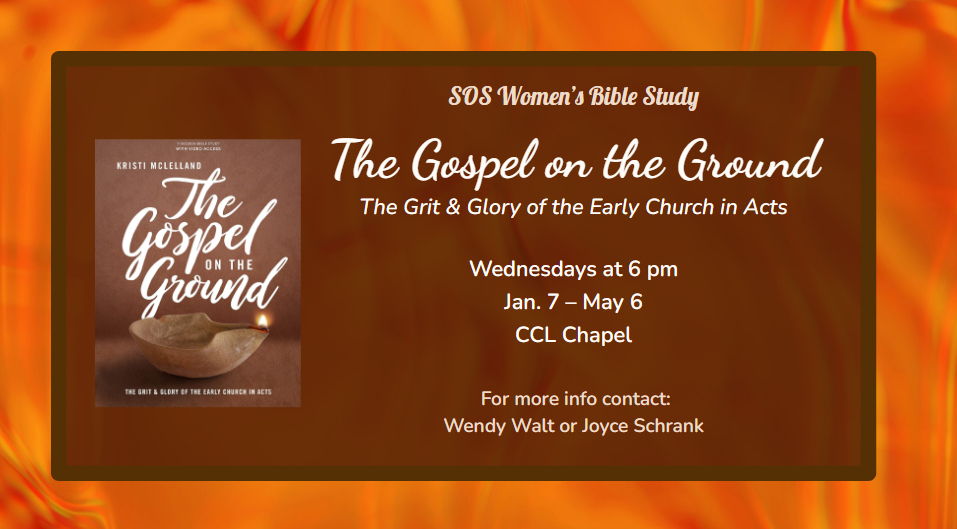 Women SOS Women’s Bible Study: The Gospel on the Ground – The Grit & Glory of the Early Church in Acts Wednesdays at 6pm in the CCL Chapel January 7 – May 6 For the Read More »
